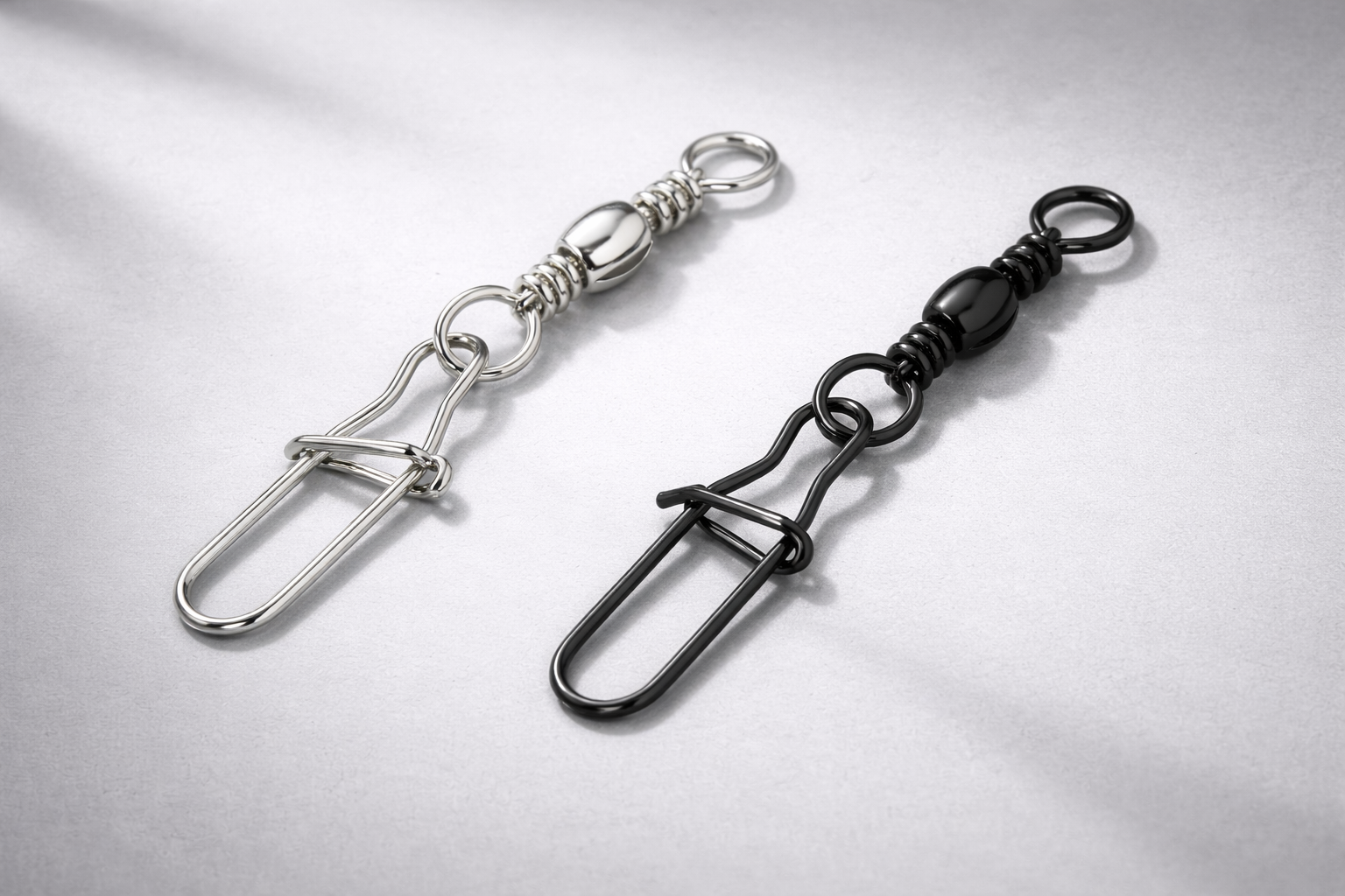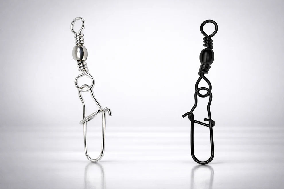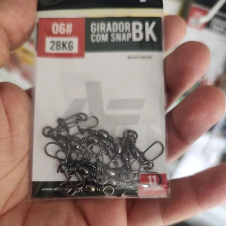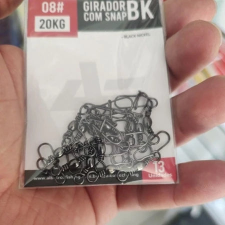 Girador Snap Black Nickel O Girador com Snap Albatroz Black Nickel é um acessório que une a importância de uma destorcedor, a praticidade de um terminal-engate rápido que é o snap. Muito leve e resistente, é usado na pesca de Espadas no mar, bastando o pescador trocar o encastoado a cada captura, facilitando a colocação da sardinha (isca) em um novo empate, agilizando a pesca. Fabricado em aço carbono (composição da liga que confere ao metal o seu nível de resistência mecânica) com acabamento niquelado, serve como terminal (de troca rápida) principalmente na pesca com iscas artificiais que causem torção de linha como hélices e colheres por exemplo. Quando a opção for molinete ao invés de carretilhas, o Girador com Snap Albatroz 303D Nickel ajudará muito o pescador, bem como na pesca de corrico onde também sofremos com problemas de torção de linha. Especificação do Produto: Modelo: Girador e Snap Albatroz Forjado em Aço carbono