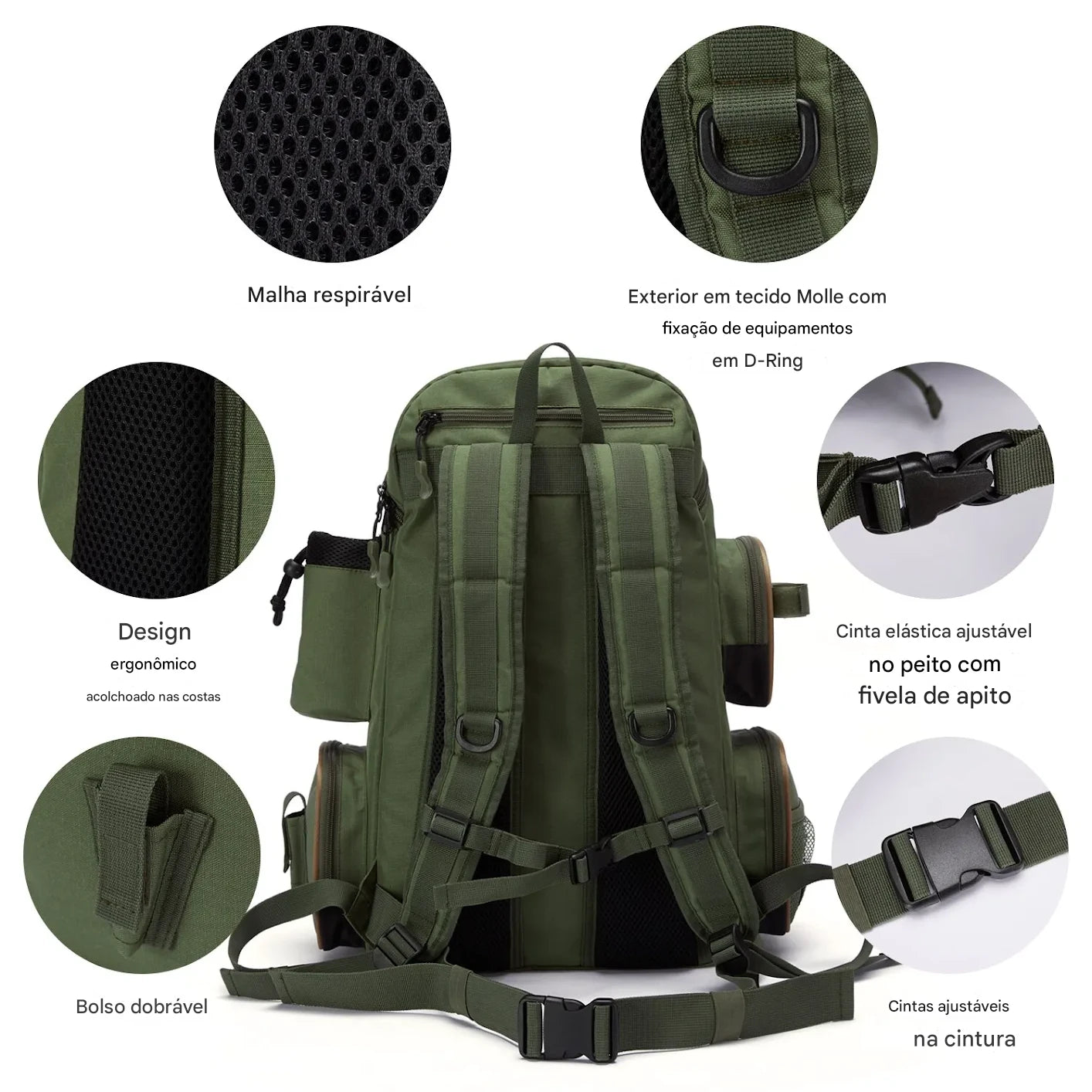 Materiais táticos: tecido resistente com reforços em pontos de carga; aguenta peso e tranco de viagem/barco.