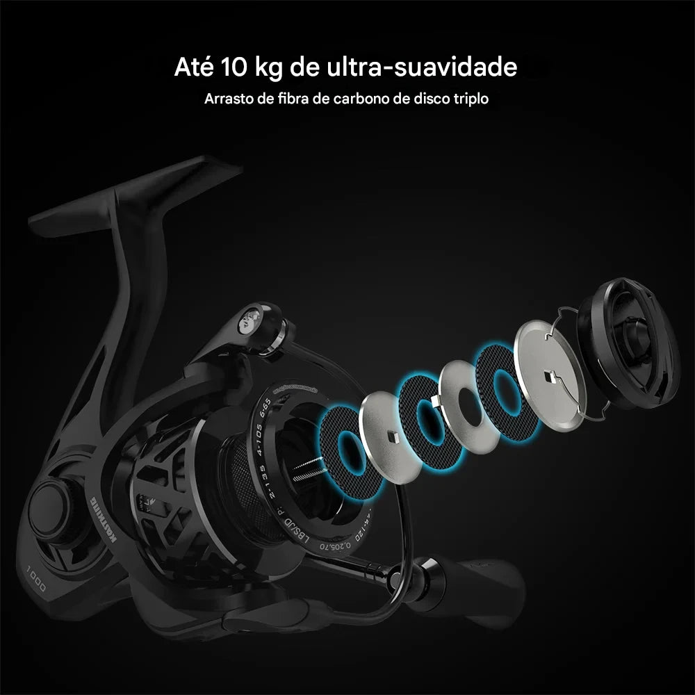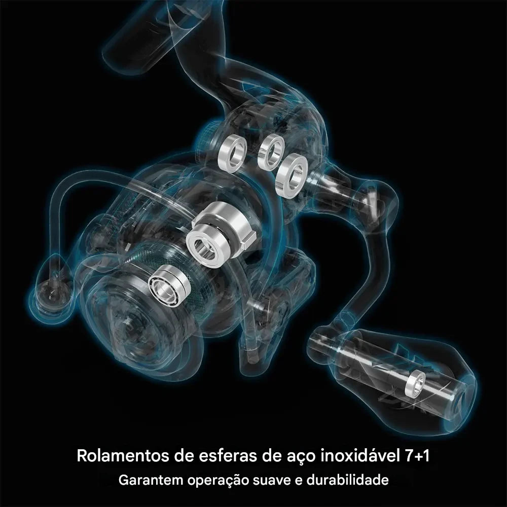 projeto leve com corpo/rotor em grafite, foco em ultralight e gelo (tamanhos 500/1000) e ótimo custo-benefício. Drag de fibra de carbono (8,8 lb no 500; 18 lb no 1000/2000; 22 lb no 3000/4000), 7+1 rolamentos e relação 5,2:1. Carretel CNC braid-ready e sistema DSSR para operação estável. Indicado para água doce e também uso costeiro leve.