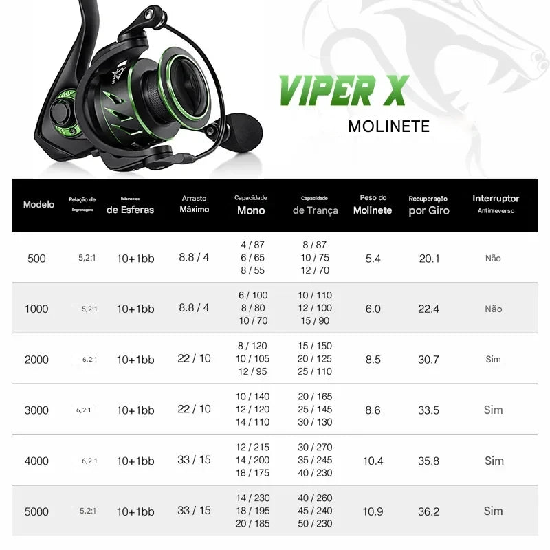 o Viper X é um molinete leve de corpo em grafite com foco em velocidade e benefícios. Oferece duas relações de recolhimento (6,2:1 e 5,2:1, conforme o tamanho), 10+1 rolamentos inox selados e drag com arruelas de carbono — um conjunto equilibrado para quem quer recolhimento rápido e desempenho consistente em água doce ou salgada leve.