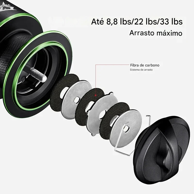 Suavidade real : 10+1 rolamentos inox duplamente selados + eixo principal inox e engrenagem de liga de zinco ; arruelas de carbono sem arrasto.